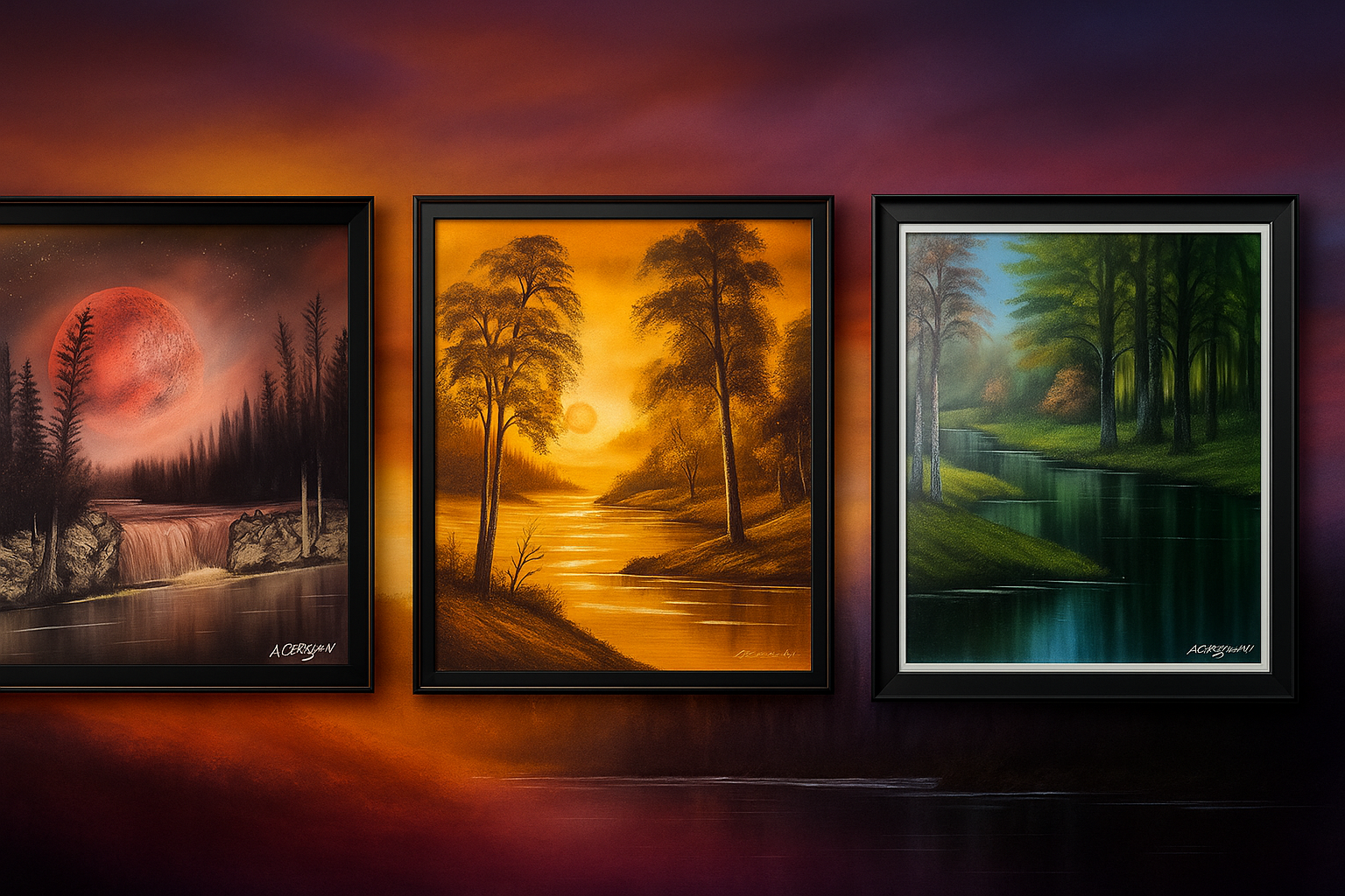 I paint using the wet-on-wet technique made famous by Bill Alexander and Bob Ross, which allows me to work spontaneously, blending color and texture directly on the canvas. Each painting is an exploration of atmosphere and emotion — an attempt to capture not just how a place looks, but how it feels.